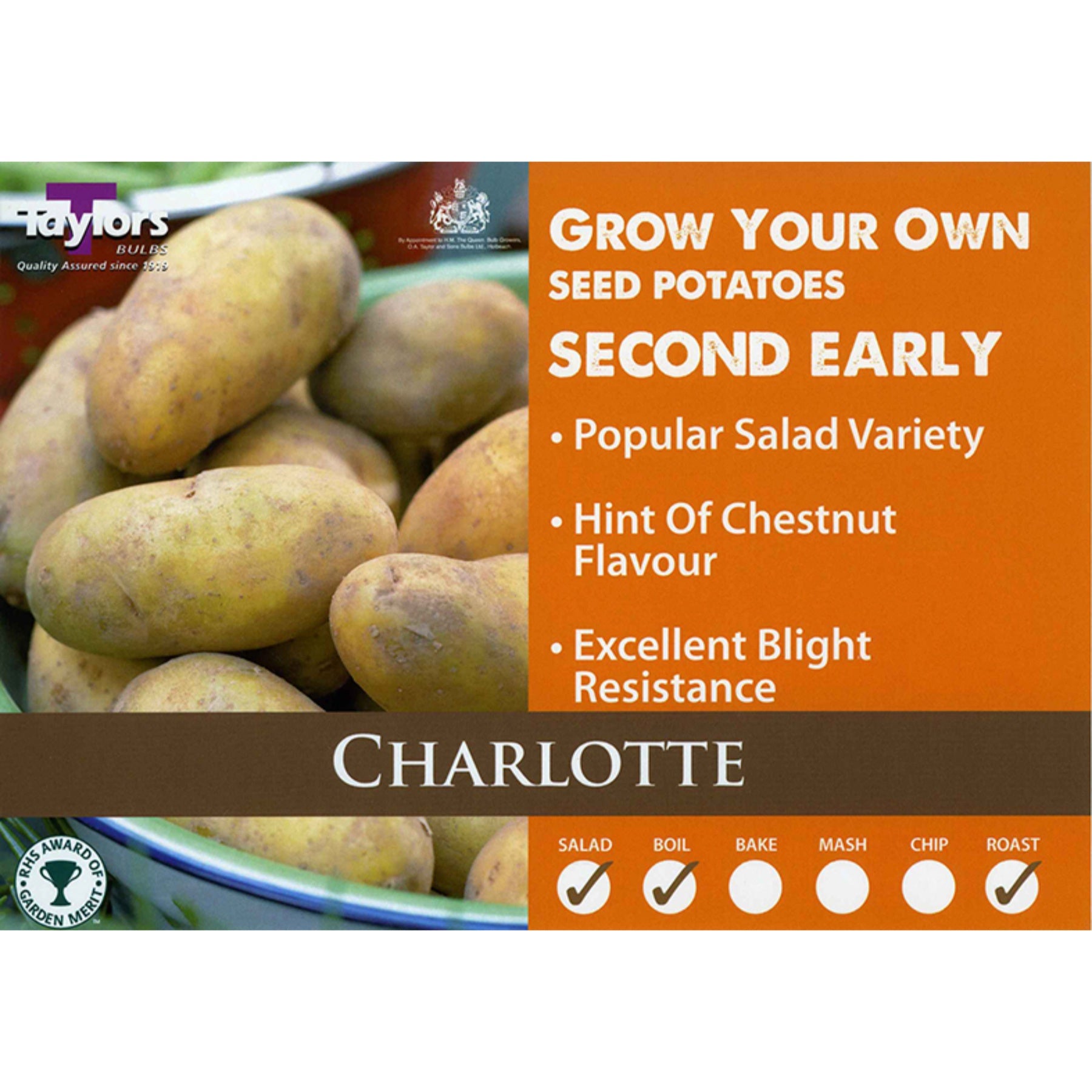Without doubt Charlotte are the most popular salad potato sold in the country. A second early variety they produce long, oval, waxy potatoes with buttery yellow skins, and will grow larger than most other types of salad potatoes if left in longer. Holder of a prestigious RHS Award of Garden Merit these potatoes are simply delicious steamed or boiled, hot or cold. Supplied loose in kilos. High quality certified seed potatoes for reliable crops.