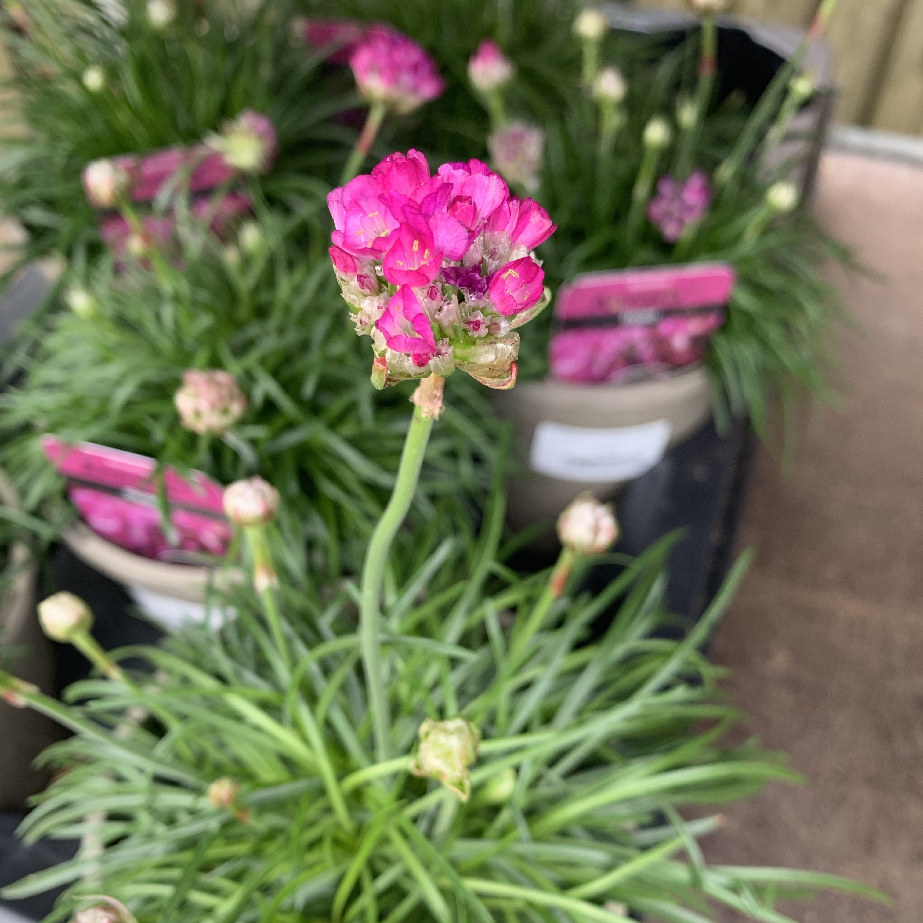 Also known as Sea Thrift, or Sea Pinks, Armeria are grassy hummock type plants, with slender stems topped with globes of small flowers, in spring and in summer. Easy to grow, they'll cope with almost any soil type as long as it is free draining, and any position, be it sheltered or exposed. Loved by pollinators, these evergreen dainty little plants are suited to all sorts of uses from rockeries to screes to pots and more. Armada Rose features dark rose coloured flowers, and grows c 10cm high by 15cm across.