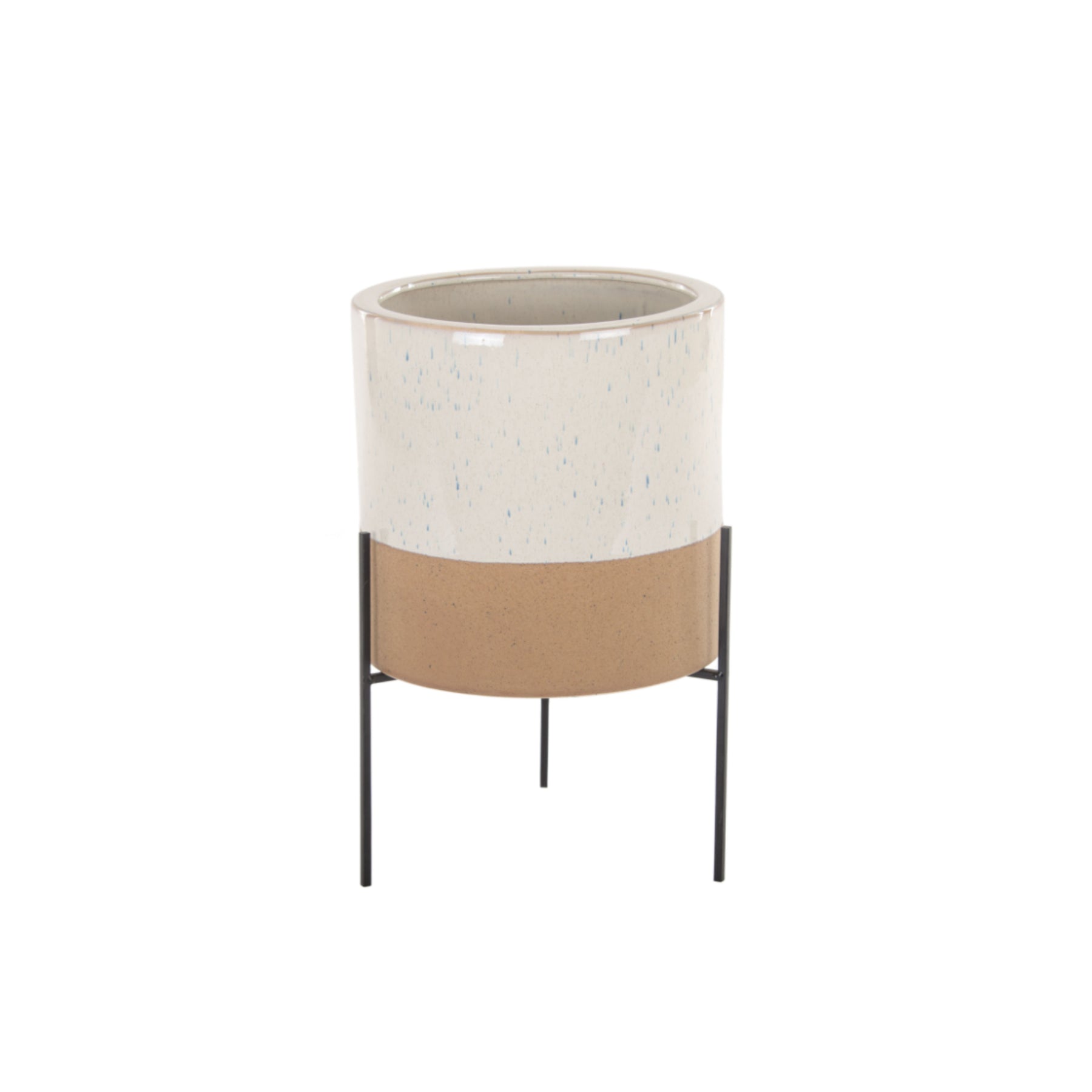 This pot has a white glaze with a speckle finish and a grit sand style finish around the base. comes with a metal stand.