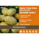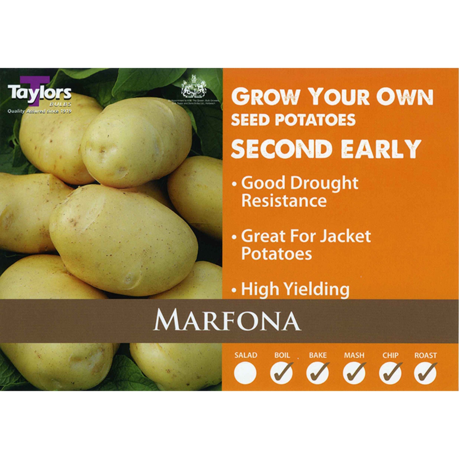 Marfona are a high yielding second early potato, producing large round/oval tubers with a light yellow skin and firm, slightly waxy insides, perfect for baking, but also good as a chipper or boiler too. Suits a wide range of soil conditions and reasonably disease resistant, it consistently produces a good crop. Supplied in a 2kg carrypack. High quality certified seed potatoes for reliable crops.
