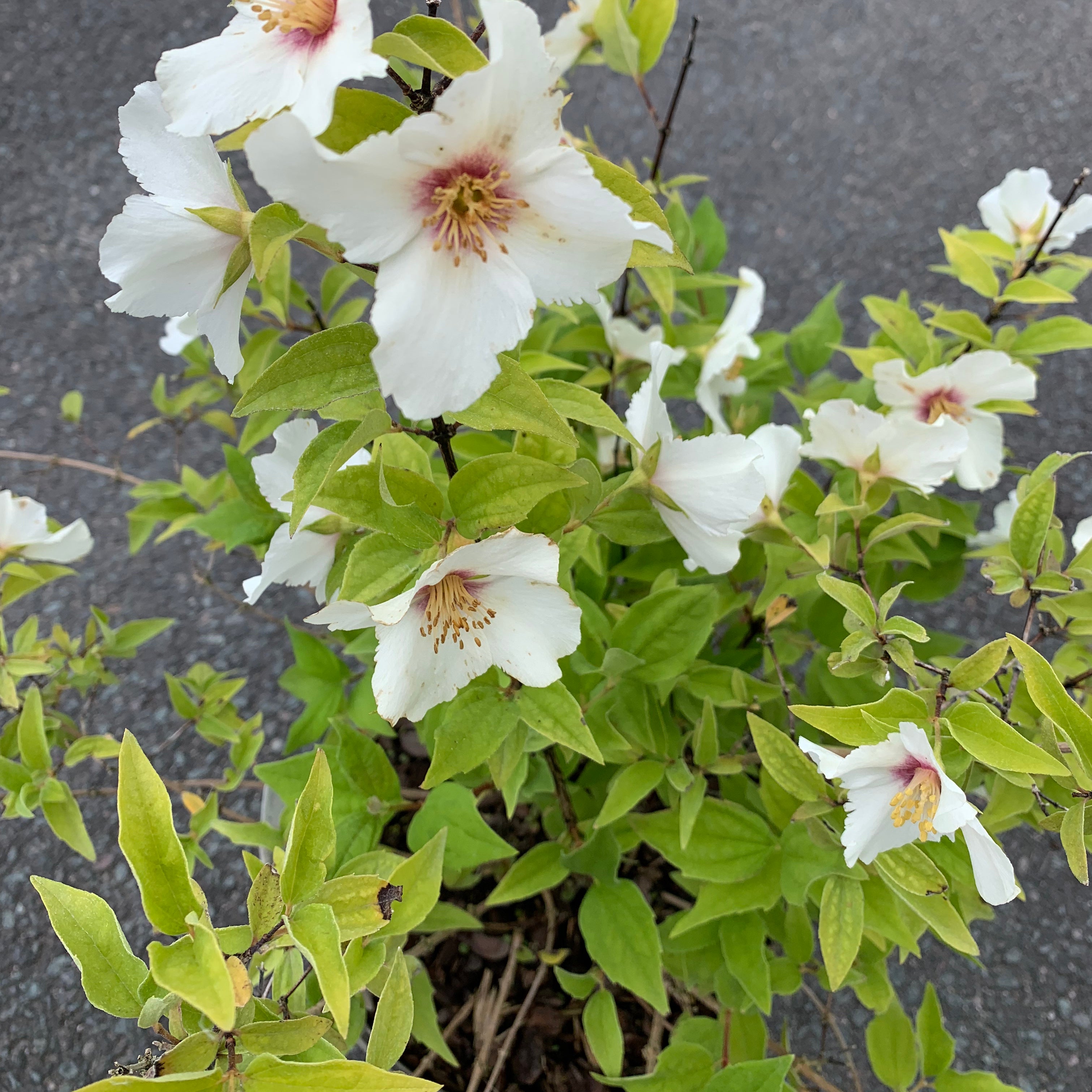 One of the most attractive of the Philadelphus, Belle Etoile is a deciduous shrub with mid green ovate leaves in springh and summer, which often colour well in the autumn. In summer it is covered in pure white four petalled blooms, flushed maroon at the centre surrounding the bright gold stamens. Commonly called the mock orange, because of the beautiful orange scent that emanates from the flowers, which is one of the most heavenly scents in the garden. May reach 1.5m high in time by perhaps 2 to 2.5m wide if left unchecked, this is a graceful and arching shrub which requires little or no annual pruning, although taking out up to a third of old stems completely on an established plant will keep a more open shape. Only prune immediately after flowering as this shrub flowers on a previous year's growth. Extremely hardy, and rabbit resistant, great for pollinators, and thrives in most soils in partial or full sun. Recommended.