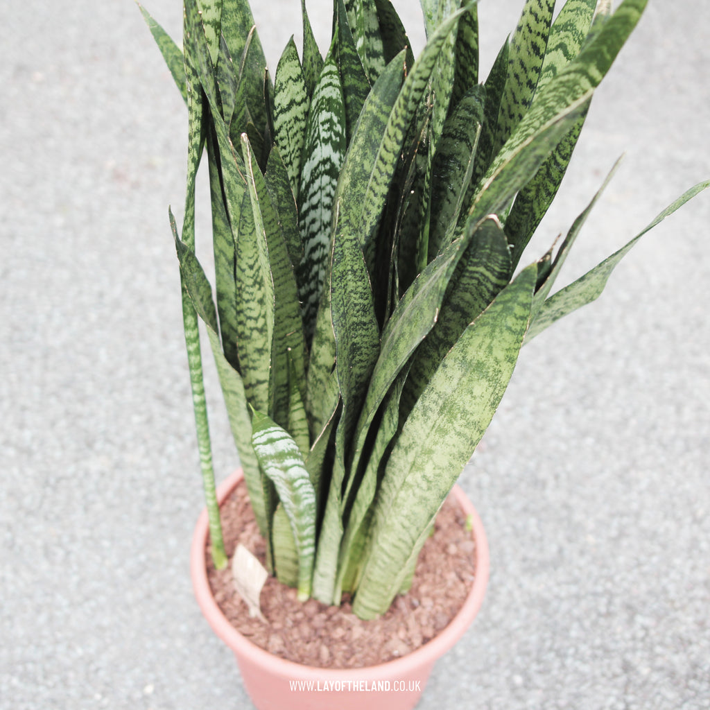 Mother-in-laws Tongue. An excellent foliage plant with stiff sword-like leaves with darker green bands tolerant of a wide range of conditions. Best out of direct sunlight, but in good indirect light. Needs only infrequent watering and therefore is very easy to care foir. Possesses good air purification qualities, so suitable for a bedroom or corridor. Max Height 100cm. Max Spread 45cm. Flowers March to May. Min temp 50øF / 10øC.